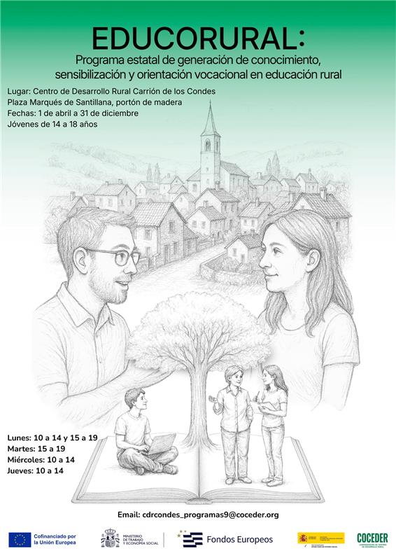 “EDUCORURAL: PROGRAMA ESTATAL DE GENERACIÓN DE CONOCIMIENTO, SENSIBILIZACIÓN Y ORIENTACIÓN VOCACIONAL EN EDUCACIÓN RURAL” está financiado por el Ministerio de Derechos Sociales, Consumo y Agenda 2030 para la realización de actividades de interés general con cargo a la asignación tributaria del Impuesto sobre la Renta de las Personas Físicas y cofinanciado en el marco del Programa de Inclusión Social, Garantía Infantil y Lucha contra la Pobreza, por la Unión Europea CCI 2021ES05SFPR003 en la operación “Itinerarios Integrales frente la despoblación en Inclusión Social”.