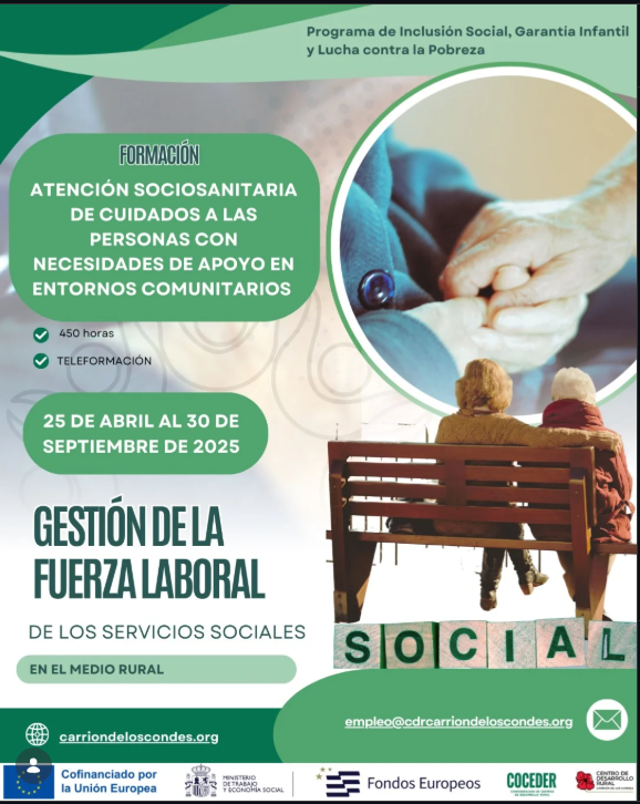 Este curso se enmarca dentro del programa 鈥淕esti贸n de la fuerza laboral de los servicios Sociales en el medio rural: mirando hacia el futuro禄, financiado por la Uni贸n Europea e impulsado por COCEDER. Esta operaci贸n del Ministerio de Trabajo y Econom铆a Social se enmarca en el Programa de Inclusi贸n Social, Garant铆a Infantil y Lucha contra la pobreza (prioridad 6), cofinanciado por con el Fondo Social Europeo Plus (FSE+).