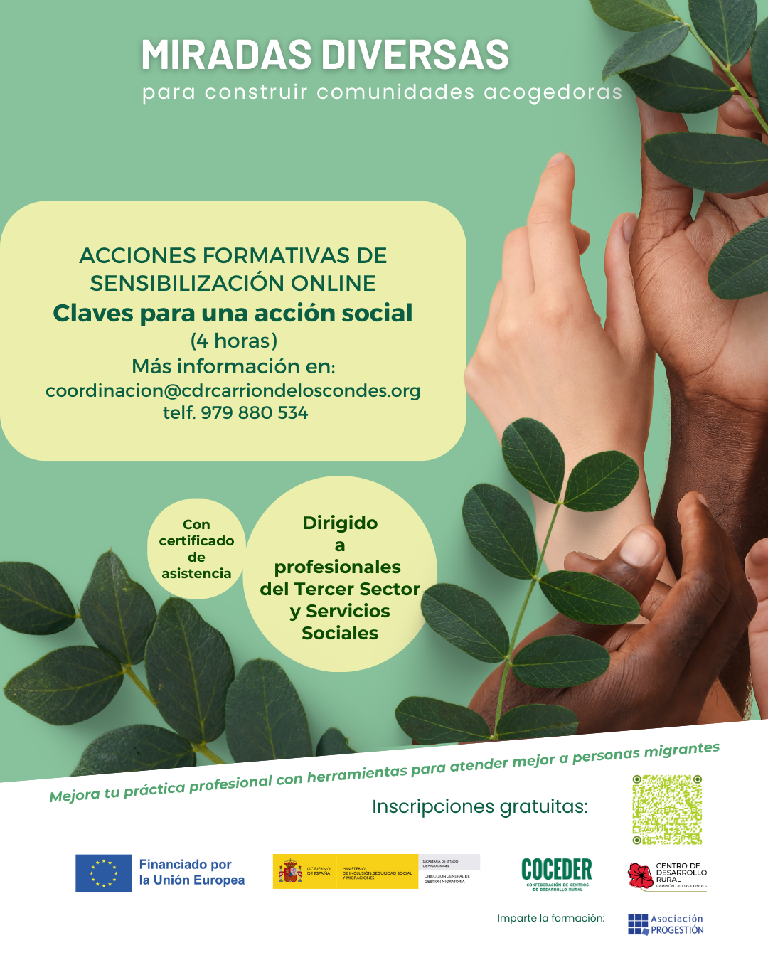 El CDR Carrión de los Condes te invita a participar en el curso online gratuito “Miradas Diversas para Construir Comunidades Acogedoras”, orientado a profesionales del tercer sector. El objetivo del curso es fortalecer la atención y acompañamiento a la población migrante, promoviendo entornos rurales más inclusivos y respetuosos con la diversidad.