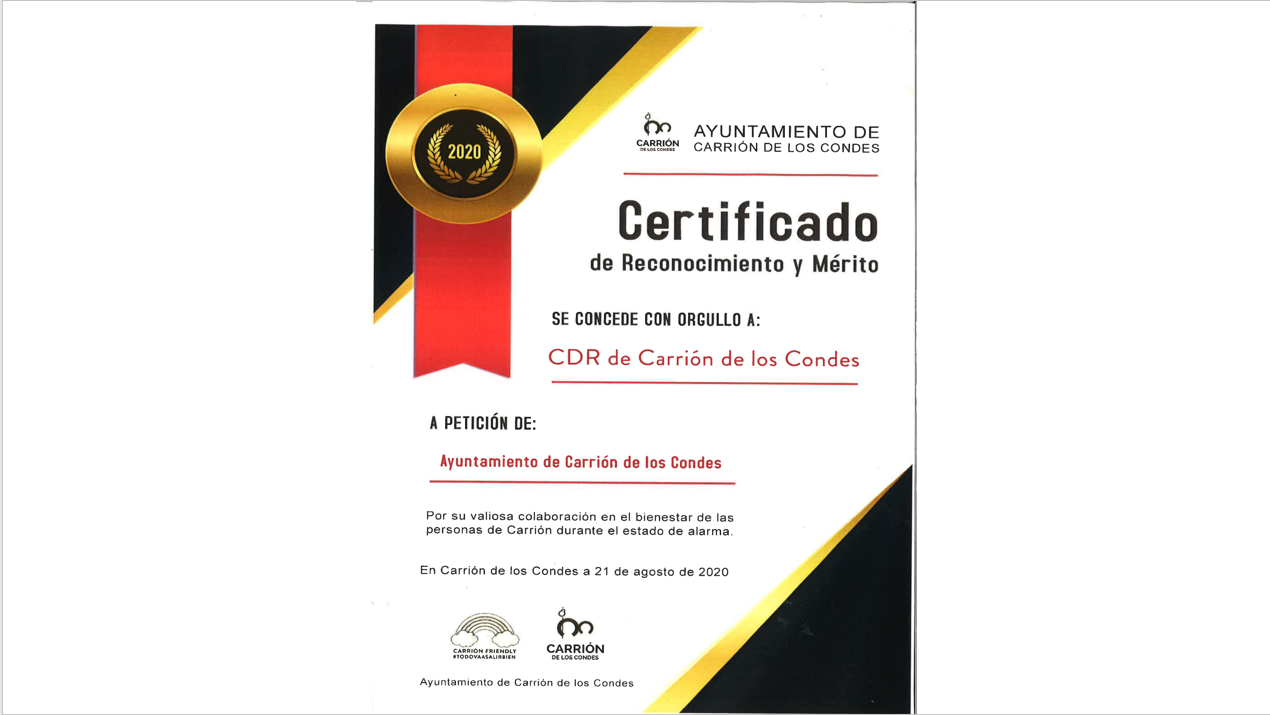 Reconocimiento al Centro de Desarrollo Rural de Carrión de los Condes por su valiosa colaboración en el bienestar de las personas de Carrión durante el estado de alarma en el año 2020.