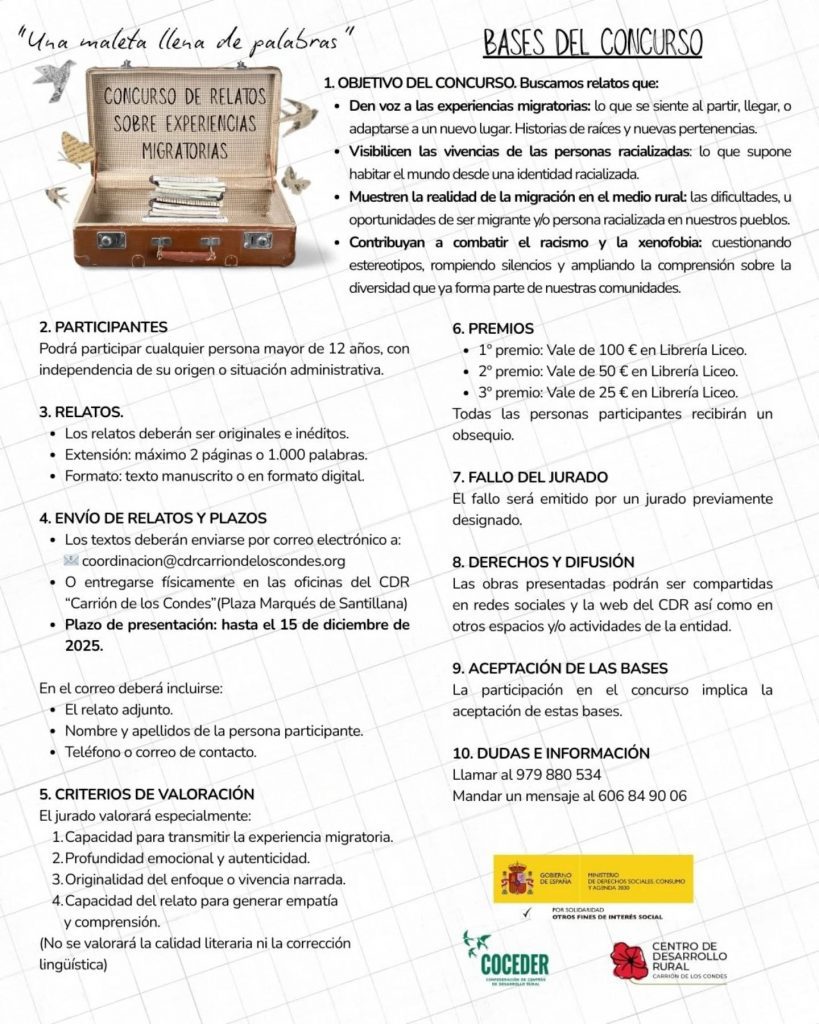 Desde el Centro de Desarrollo Rural Carrión de los Condes lanzamos este concurso narrativo para recoger voces, vivencias y miradas diversas en torno a la migración, las experiencias racializadas y la vida en el medio rural.