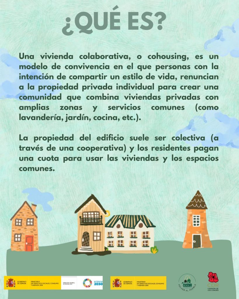 Una vivienda colaborativa, o cohousing, es un modelo de convivencia en el que personas con la intención de compartir un estilo de vida, renuncian a la propiedad privada individual para crear una comunidad que combina viviendas privadas con amplias zonas y servicios comunes (como lavandería, jardín, cocina, etc.).